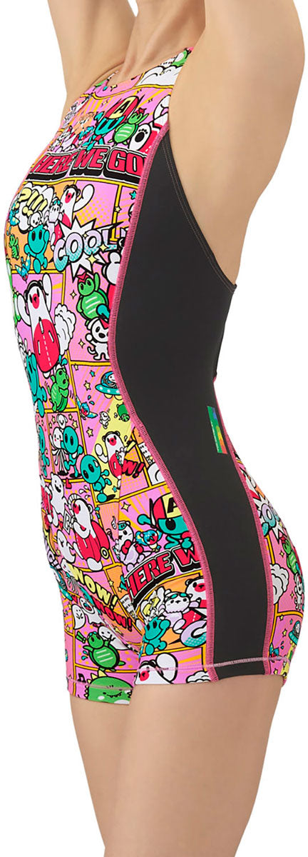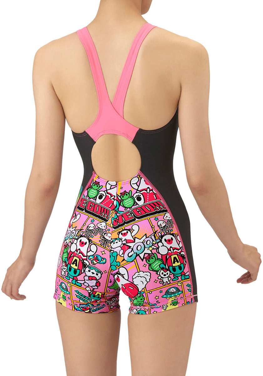 トレーニングカテゴリー「TOUGHSUITシリーズ」。大会に向けて練習を重ねる頻度が高いスイマーにオススメの練習用水着。環境に配慮したリサイクルポリエステル素材「タフスキンE、EP及びT2E」を使用し塩素に強く長持ち。全てのスイマーに人気のアリーナくんの総柄ミドルレッグタイプ。AS5FWM00Lで展開するテーマ(宇宙や地球)と連動する冒険物語。アメリカンコミック調の柄は鮮やかな色合いとダイナミックな線が特徴でインパクトのあるデザイン。アリーナくんたちと地球外生命体(怪獣、宇宙人、お化け)が出会い、友達になる過程をプリントに表現。地球を守る戦隊ヒーロー風のスタイルを取り入れることで、アリーナくんたちのチームとしての一体感を演出。カラフルな4配色の展開。前身頃、後身頃に黒の裏地付き(脇は裏なし)※この商品は縫製上、一点一点プリント柄の見え方に違いが生じますので予めご了承ください。