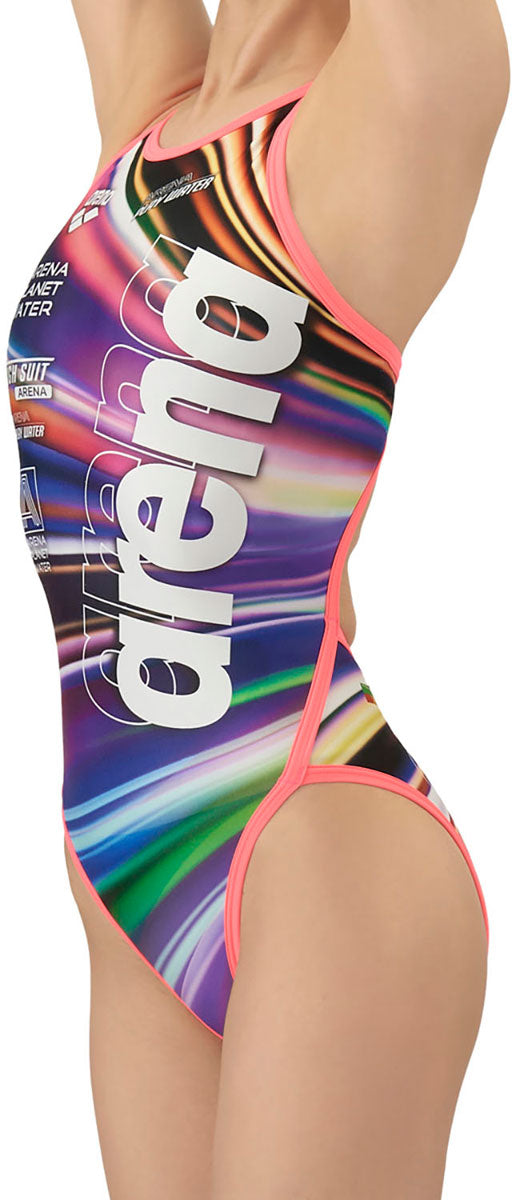 トレーニングカテゴリー「TOUGHSUITシリーズ」。大会に向けて練習を重ねる頻度が高いスイマーにオススメの練習用水着。環境に配慮したリサイクルポリエステル素材「タフスキンT2E」を使用し塩素に強く長持ち。アリーナロゴが脇に配置されたデザインの練習水着。スタイリッシュでカッコいいデザインから可愛くトレンド感があるデザインまで、幅広くバリエーションに富んだスタイルを一つの品番で表現。BKPK:地球や宇宙の光と自然の色彩の美しさから着想を得たデザイン。BKRD:チェリーのモチーフを使ったフルーティーで明るい印象を与えるデザイン。PKBL:レトロな花柄をトレンド感のある配色やロゴと組み合わせたデザインで表現。PPBK:輝く光と可愛いロゴがトレンド感と明るい印象を与えるデザイン。前身頃、後身頃に黒の裏地付き。ワンピースタイプ。