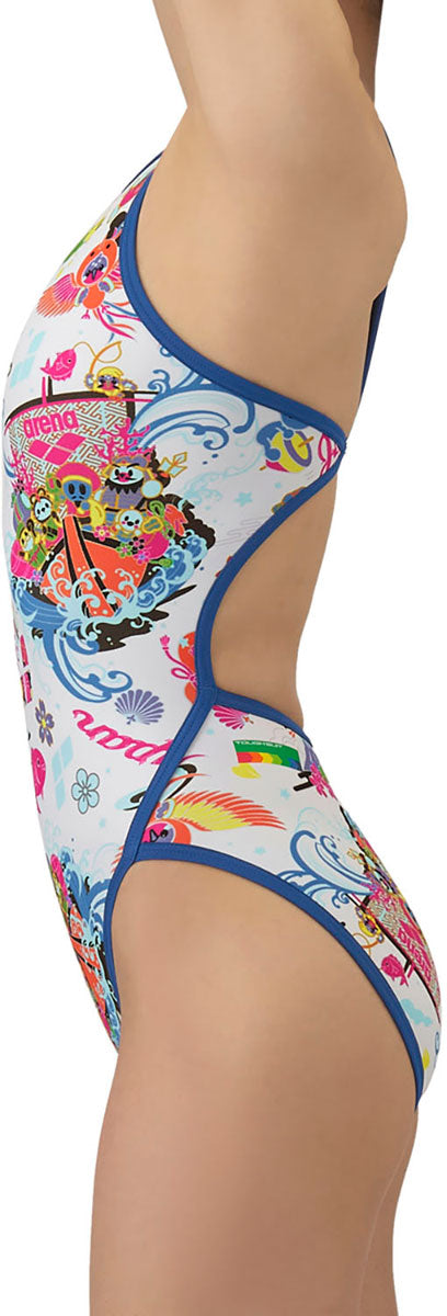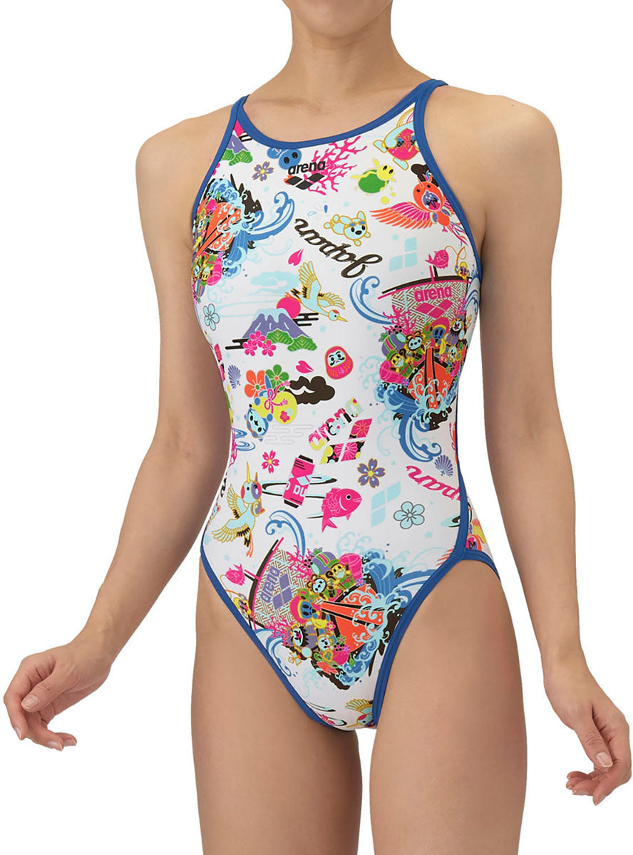トレーニングカテゴリー「TOUGHSUITシリーズ」。大会に向けて練習を重ねる頻度が高いスイマーにオススメの練習用水着。環境に配慮したリサイクルポリエステル素材「タフスキンEP」を使用し塩素に強く長持ち。全てのスイマーに人気のアリーナくんの総柄ワンピースタイプ。日本の縁起の良い和柄と海と親和性のある宝船がポイント。宝船が象徴する繁栄や幸運が着用するスイマーたちへ届くよう願いを込めたデザイン。アリーナくんと仲間たちが七福神になっている遊び心を表現。前身頃、後身頃共に黒の裏地付き。※この商品は縫製上、一点一点プリント柄の見え方に違いが生じますので予めご了承ください。