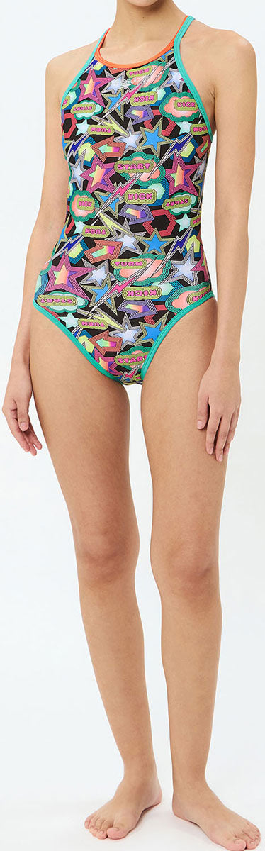 日々プールでトレーニングに励む学生やアクティブスイマーをサポートする、練習用スイムウエアコレクション「TurnS(ターンズ)」。高い耐塩素性とデザイン性を兼ね備えたレディーススーツです。毎日のハードなトレーニングを支える高い耐塩素性と、優れた4WAYストレッチ性。透けにくく安心感のある厚みと柔らかな風合いの環境配慮型素材「ENDURANCE ECO(エンデュランス・エコ)」を採用しています。ボディにフィットし、背穴脇からの水の侵入を軽減する背空きの形状。腕の動きを妨げにくいV字ストラップです。別売りのカップを使用できるフック受けが付いています(※カップは付属しておりません。SpeedoのハンギングスイムカップSE32001がオススメ)。総裏地付き。”カワイイ”がぎゅっと詰まった、ポップなプリント柄。カラフルなバインダー使いで華やかさとメリハリ感をプラス!※1点1点プリントの見え方が異なりますので、あらかじめご了承ください。