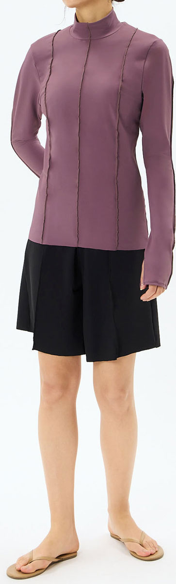 非日常でととのえるこころの健康をテーマに、大人のスイムウエアを提案する「Speedo breath(スピード・ブレス)」。コーディネート不要。これ一枚でスタイルが決まる長袖レディースセパレーツ水着です。GRS認証のすてられるべき廃棄物を100%使用したナイロン糸「RECO NYLON(レコ・ナイロン)」を使用したリサイクル素材「Sensitive Reco(センシティブ レコ)」を採用。UVケア(UPF15-30、紫外線カット率85%以上)機能付きです。長袖のトップスは、ハイネック仕様で首まわりの日焼けをカバー。差し込みタイプのカップ付きなので、これ一枚で水着としてご使用いただけます。フロントの縦ラインがボディラインをすっきり見せてくれます。キュロットタイプのボトムスは、インナー付きなのでアンダーの露出を気にせず、安心して着用できます。ややハイウエストのAラインシルエットのため脚長効果が期待できます。コンビニに行ける水着をコンセプトにお家、お部屋から着用したままプールやビーチへ向かうことができるアイテムです。着脱簡単なセパレーツタイプなので、小さなお子さんをお連れのママにもおすすめです。