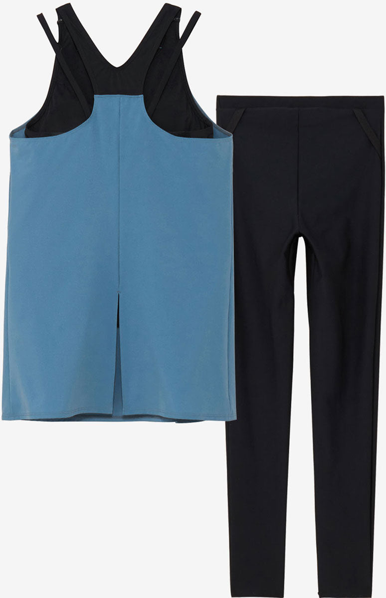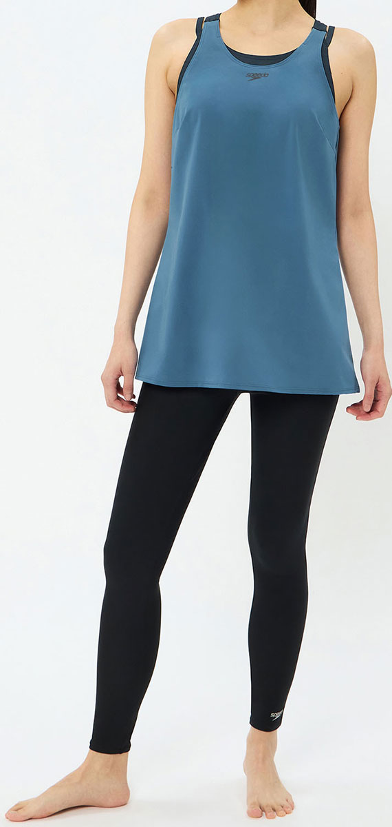 プールでのアクティビティをフレッシュに、より楽しくサポートするフィットネススイムウエアカテゴリー「Pool Athletics(プール・アスレティクス)」。ボディラインをふんわりカバーするエアリーなセパレート「AIRPA(エアパ)」シリーズよりレギンスタイプが登場。優れたストレッチ性に加え、軽い着心地とさらりとした肌触りの環境配慮型布帛素材「Soft&Stretch Taffeta(ソフト&ストレッチ・タフタ)」を採用。トップスは2枚構造でウエストラインなど隠したいところをふんわりカバーします。インナーはウエストにしっかりインできるため、めくれ上がりにくくします。華奢なストラップと幅広のYバック、2種の肩ストラップでスタイリッシュに肩まわりの露出を軽減します。水中でのめくれ上がりを抑える可動するスナップ付き。差し込みタイプのカップ付き。ボトムスは透けにくく安心感のある厚みと柔らかな風合いの環境配慮型素材「ENDURANCE ECO(エンデュランス・エコ)」を採用。ホールド感のあるハイウエスト仕様でお腹周りをすっきり見せます。足首までの10分丈。UVカット機能付き。