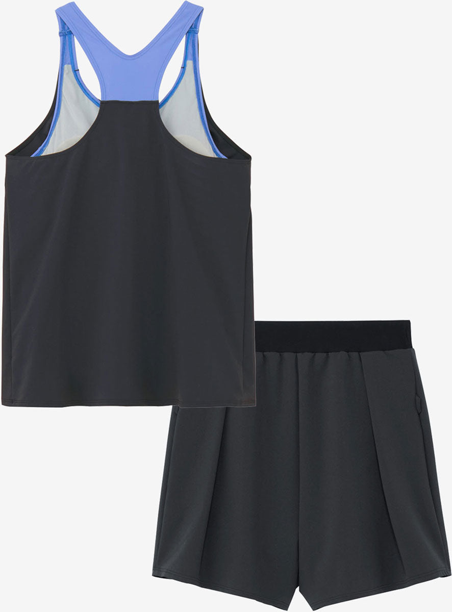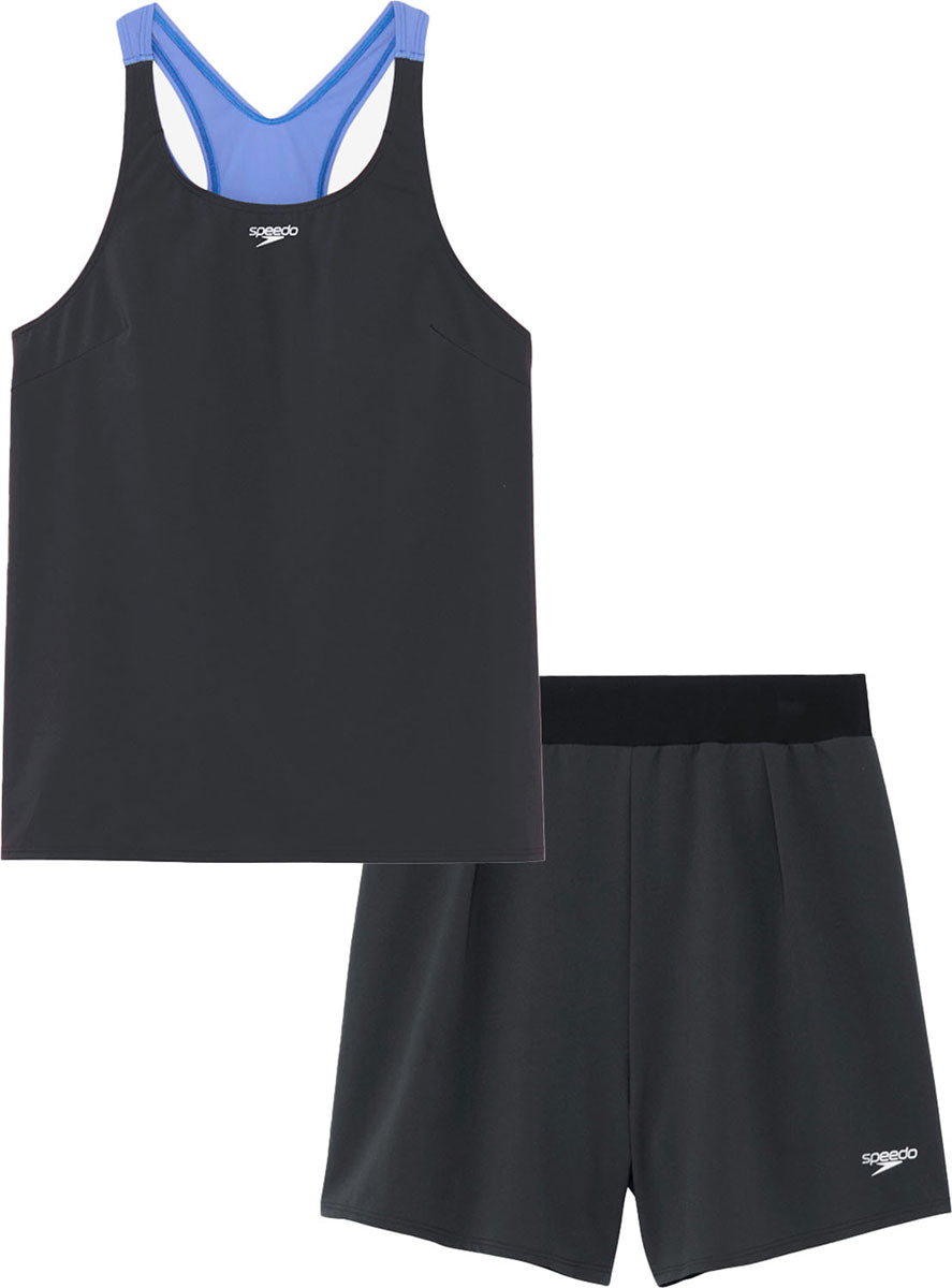 プールでのアクティビティをフレッシュに、より楽しくサポートするフィットネススイムウエアカテゴリー「Pool Athletics(プール・アスレティクス)」。ボディラインをふんわりカバーするエアリーなセパレート水着「AIRPA(エアパ)II」です。環境配慮型へアップデート。ストレッチ性に加え、軽い着心地とさらりとした肌触りの布帛素材「Soft&Stretch Taffeta(ソフト&ストレッチ・タフタ)」を採用。トップスは2枚構造でウエストラインなど隠したいところをふんわりカバーします。インナーはウエストにしっかりインできるため、めくれ上がりによる露出を軽減します。肩の動きを妨げにくいYバック。水中でのめくれ上がりを抑えるスナップ付き。差し込みタイプのカップ付き。2枚構造のボトムスは、フィット感の高いインナー付き。足さばきのよい2分丈。裾にゆとりをもたせたフレアなシルエットで脚長効果も期待できます。スポーティすぎないデザインで、プール初心者でも抵抗なく着用できます。さまざまなプールシーンで活躍します。