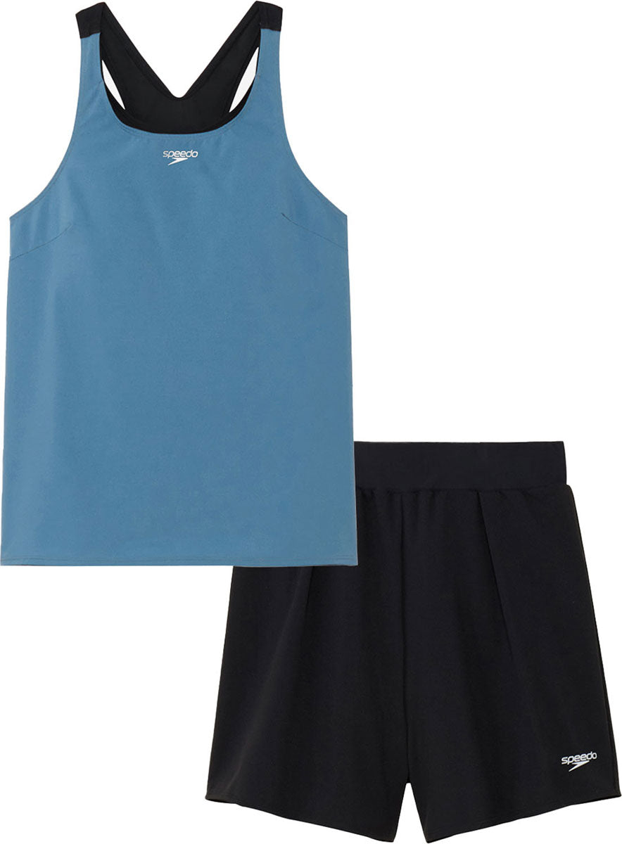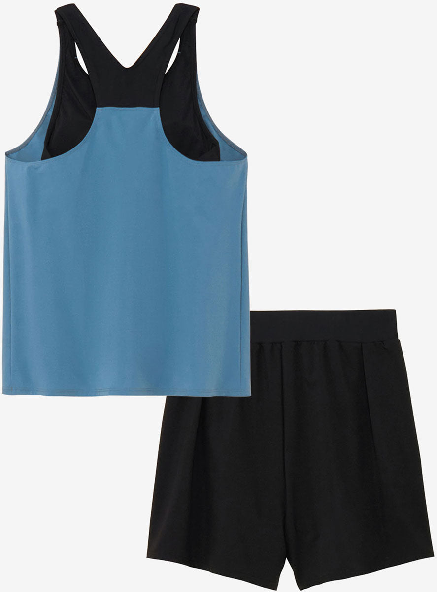 プールでのアクティビティをフレッシュに、より楽しくサポートするフィットネススイムウエアカテゴリー「Pool Athletics(プール・アスレティクス)」。ボディラインをふんわりカバーするエアリーなセパレート水着「AIRPA(エアパ)II」です。環境配慮型へアップデート。ストレッチ性に加え、軽い着心地とさらりとした肌触りの布帛素材「Soft&Stretch Taffeta(ソフト&ストレッチ・タフタ)」を採用。トップスは2枚構造でウエストラインなど隠したいところをふんわりカバーします。インナーはウエストにしっかりインできるため、めくれ上がりによる露出を軽減します。肩の動きを妨げにくいYバック。水中でのめくれ上がりを抑えるスナップ付き。差し込みタイプのカップ付き。2枚構造のボトムスは、フィット感の高いインナー付き。足さばきのよい2分丈。裾にゆとりをもたせたフレアなシルエットで脚長効果も期待できます。スポーティすぎないデザインで、プール初心者でも抵抗なく着用できます。さまざまなプールシーンで活躍します。