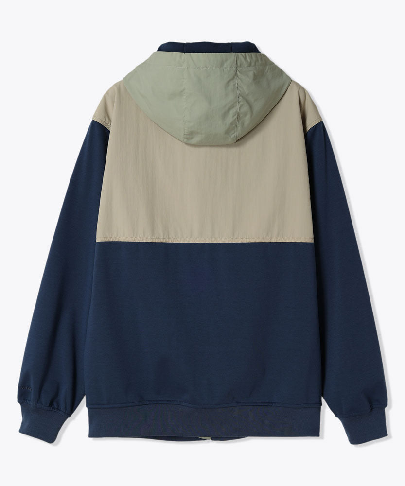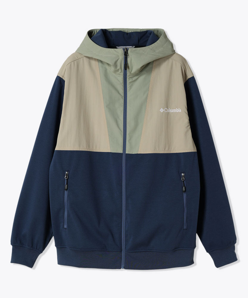 スウェット生地×布帛生地のスポーティな配色デザインでコロンビア定番人気のフルジップフーディー。