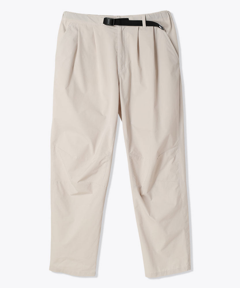 ウエストはナイロンベルトを設け、フィット感の調整も簡単。フロントはタック入りで腰元はゆとりをもたせ、ややゆったりとしたテーパードシルエットでリラックス感がありつつも、足さばきの良いすっきりとしたフォルムに仕上げました。また、膝の形状に合わせた立体的な裁断により、屈伸や足上げ動作もスムーズに行うことができます。