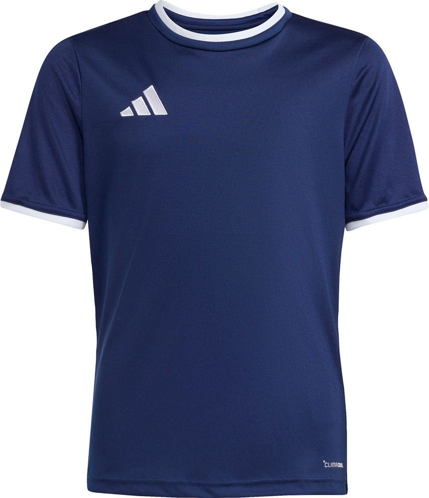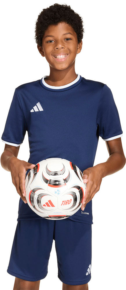 サッカーでは、細部へのこだわりが大切。エントラダ 26 ジャージー キッズは、若いサッカー選手が快適に試合へ集中するための一着。シンプルながら革新的なデザインなので、あらゆるレベルのプレーヤーにぴったり。涼しく、ドライに、準備は万端。クライマクールが汗を吸収発散して、涼しくドライなコンディションをキープ。培ったテクニックを発揮することに集中できる。インターロック生地により、耐久性とソフトな肌触りを両立。クルーネックとアディダス バッジ オブ スポーツの刺しゅうがスタイリッシュな雰囲気を演出。柔軟に動けるレギュラーフィットなので、タックルやシュートも自由に決められる。学校の試合でも、地元のリーグ戦でも、アクティブにサッカーへの情熱を輝かせるお子さまをこのジャージーでサポートしよう。
