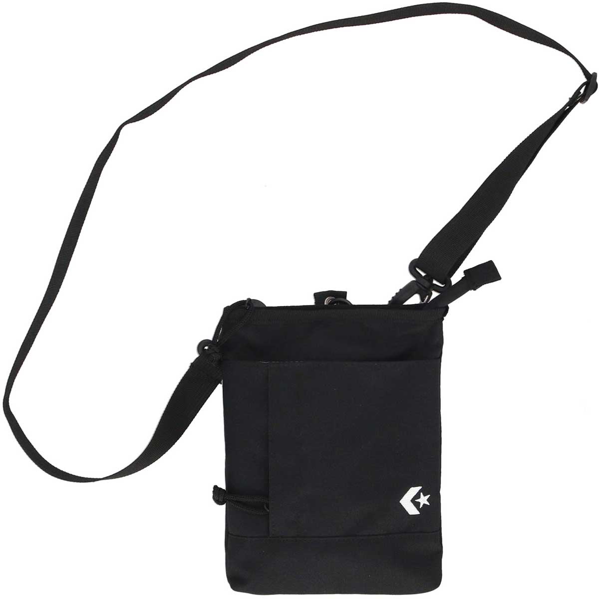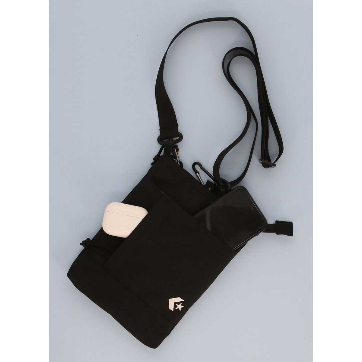 生地には地球環境を考えた再生ポリエステルを使用。小ぶりなのにフロント面に2つのポケット、メインスペースにはファスナーを装備しました。ショルダーベルトでもカラビナでも使える2WAY仕様。コスパにも優れています。