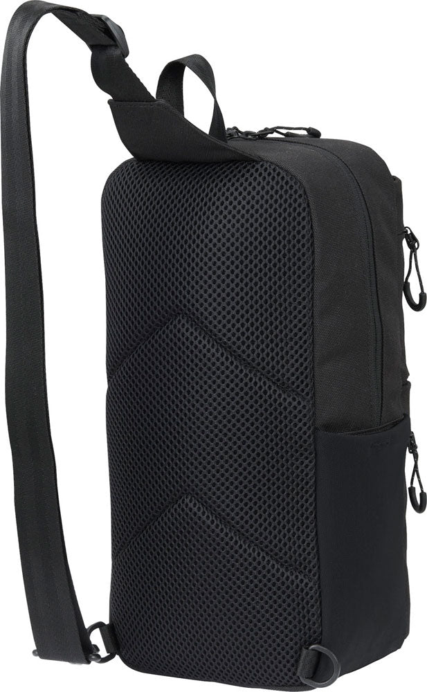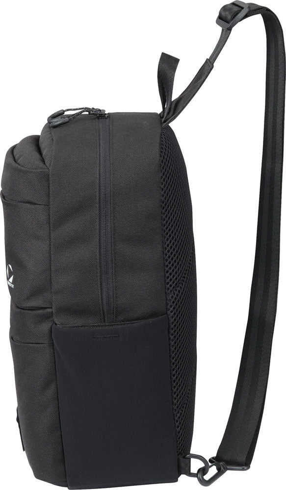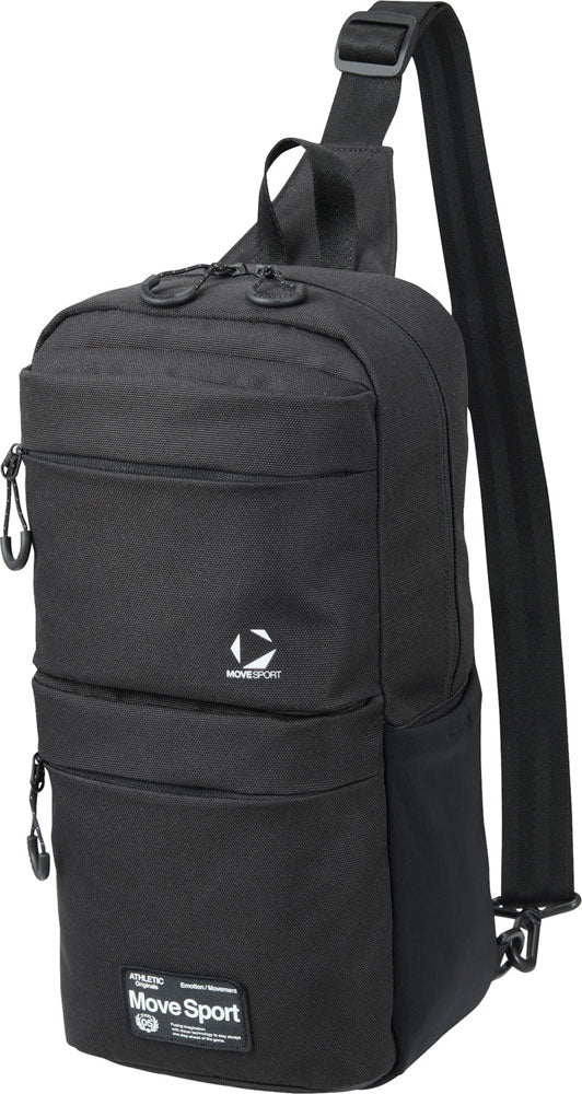 本体にはっ水加工を施したポリエステル生地を使用したショルダースリングバッグです。オリジナルロゴ入りの裏地には抗菌防臭加工を施しています。スリングバッグとしては容量大きめな10Lサイズで、貴重品だけでなく、薄手の上着やキャップなども収納することができます。両サイドには500mlペットボトルや折りたたみ傘を収納できるストレッチメッシュポケットを、正面にも小物などを収納できるポケットを搭載し、充実の収納力です。