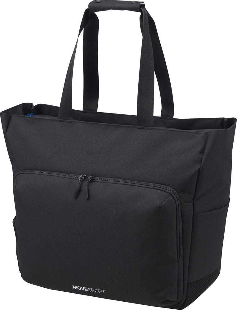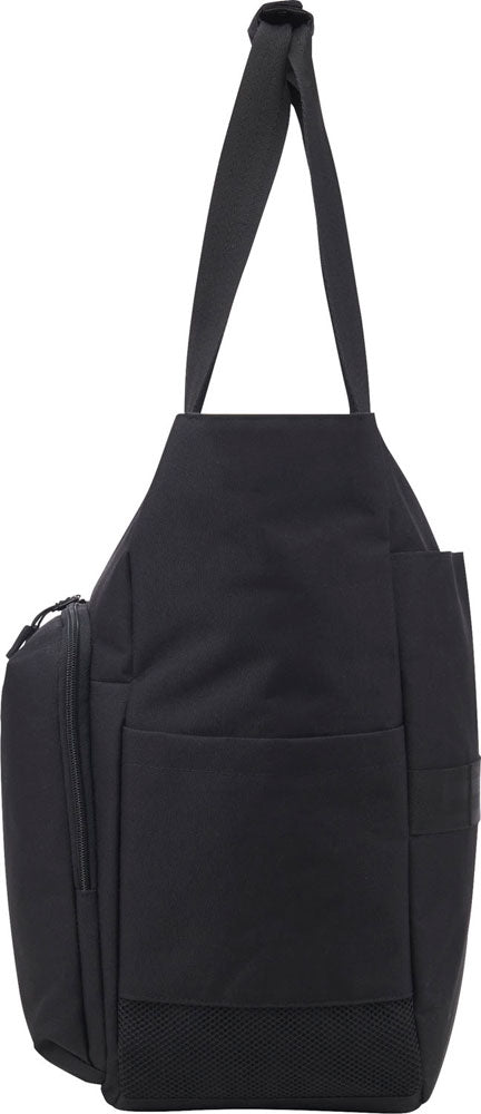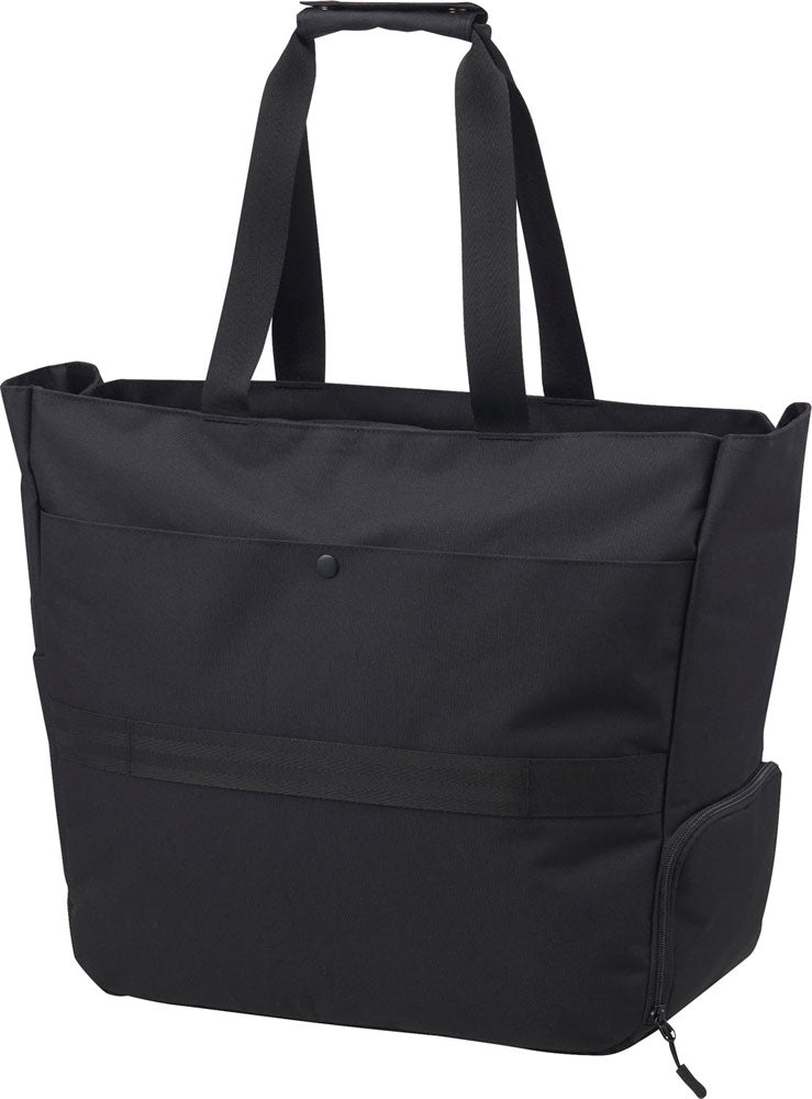 本体にはっ水加工を施したポリエステル生地を使用したトートバッグです。オリジナルロゴ入りの裏地には抗菌防臭加工を施しています。サイドのファスナー式のシューズポケットに、ペットボトルなどを入れるのに便利な底メッシュポケット、前側の大きめのファスナーポケット、さらに内ポケットなど、充実の収納力です。背面にはキャリーケースハンドルにかけられるベルトを搭載。スポーツ、出張、旅行など様々なシーンで活躍する便利なトートバッグです。