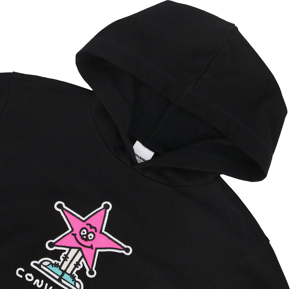 コンバースのジュニアスウェットパーカ―。Yutaka Kobayashiさんの星のイラストを採用。裏地はタオル地のように柔らかい、頑丈で汗を吸収しやすい素材を使用。