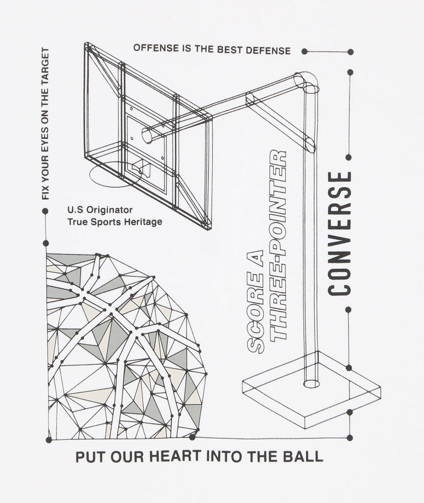 コンバースのプラクティスTシャツ。ワイヤーフレームのバスケットボールを表現したデザイン。柔らかな肌触りに吸汗速乾を兼ね揃えたスポーツ向けアイテム。