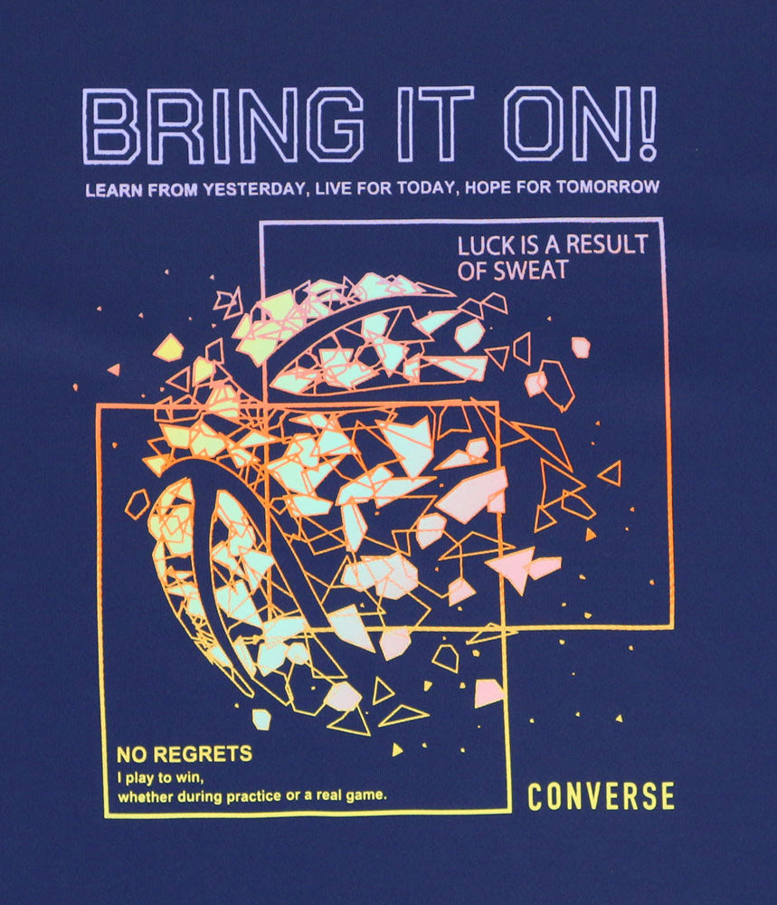 コンバースのジュニアロンT。鮮やかなグラデーションを使用したワイヤーフレームのバスケットボールデザイン。柔らかな肌触りに吸汗速乾を兼ね揃えたスポーツ向けアイテム。