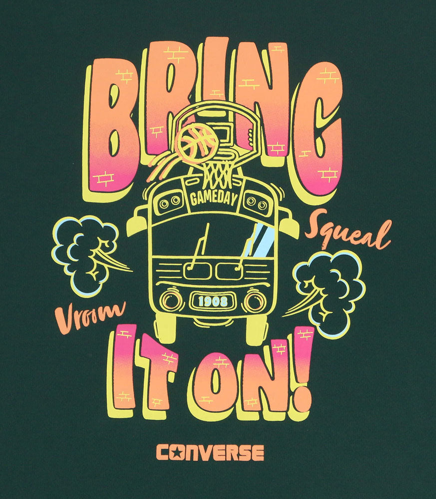 コンバースのジュニアロンT。移動用バスケットゴールをポップに表現したデザイン。柔らかな肌触りに吸汗速乾を兼ね揃えたスポーツ向けアイテム。