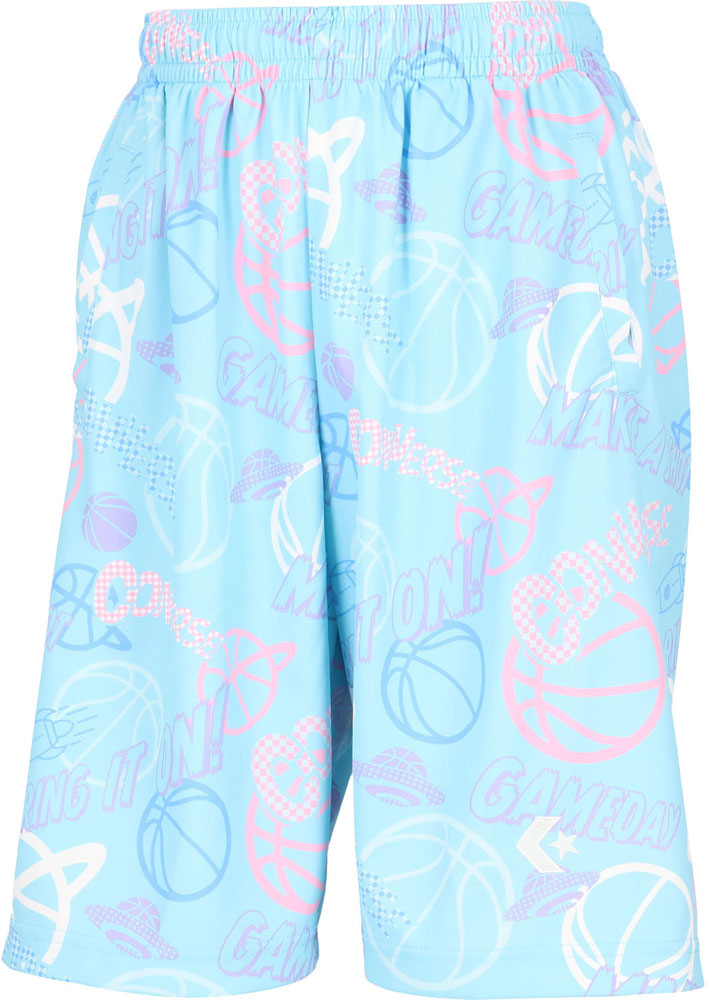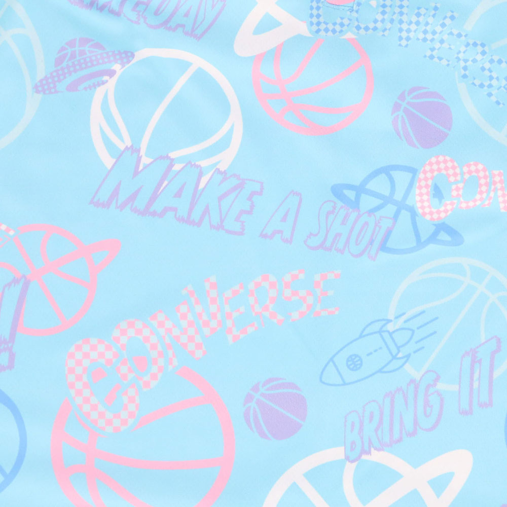 コンバースのジジュニアバスパン。バスケットボールのアイコンをカラフルに表現した総柄パンツ。柔らかな肌触りに吸汗速乾を兼ね揃えたスポーツ向けアイテム。