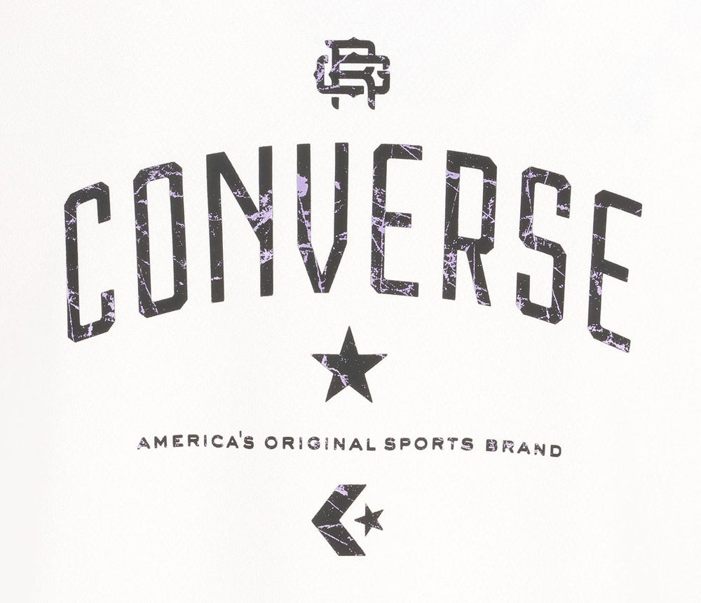 コンバースのトップライン、ゴールドシリーズ。吸汗、速乾性のある機能素材を使用し、シンプルなカレッジ調グラフィックの中に柄を絡ませたのがポイントのフロントプリントのロンT。左袖の金糸刺繍がポイント。シーホース三河選手着用予定品番。