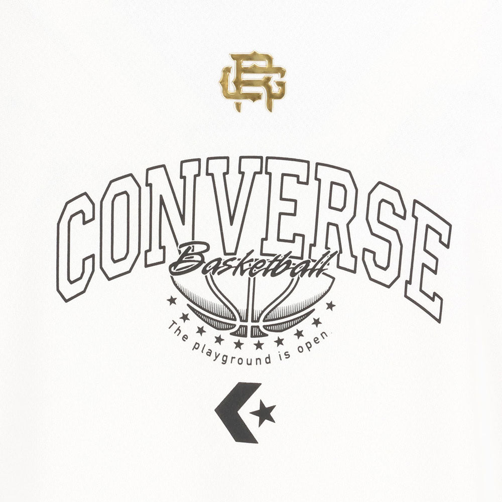 コンバースのトップライン、ゴールドシリーズ。吸汗、速乾性のある機能素材を使用し、シンプルなカッレッジ調フロントプリントロンT。フロントのGLORY ROADアイコン転写マークと左袖の金糸刺繍がポイント。シーホース三河選手着用予定品番。
