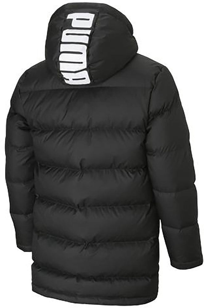 袖口インナーカフス、両サイドのアウトポケットが特徴のミドルダウンコート。フードのPUMA がデザインポイント。