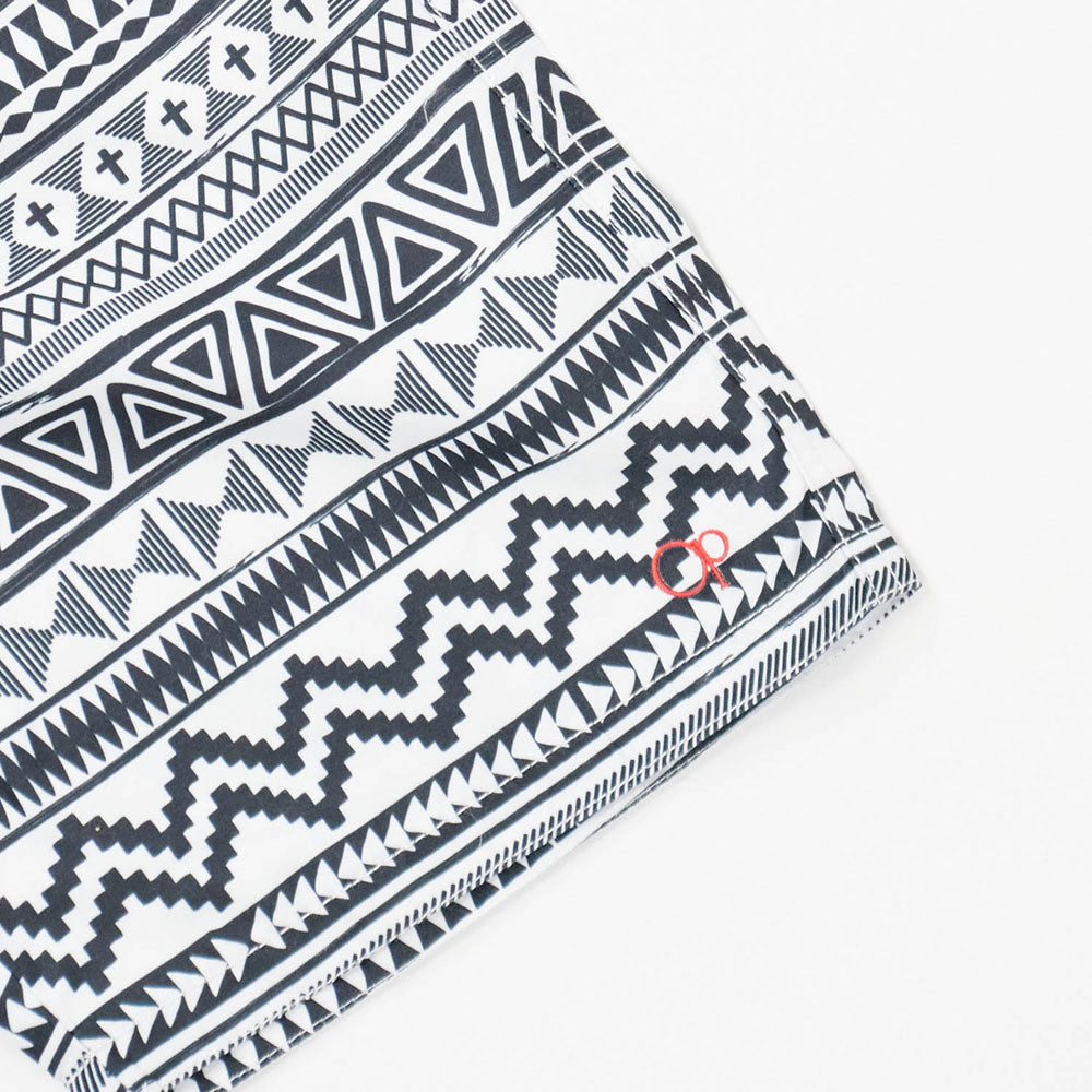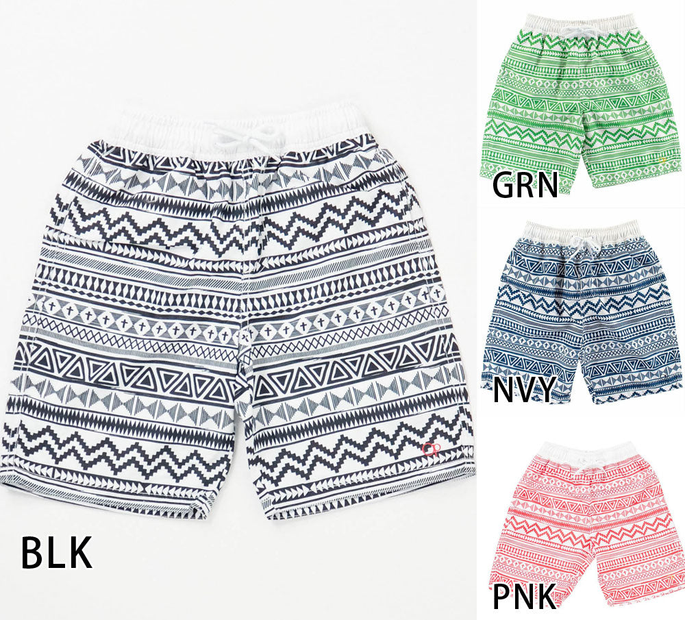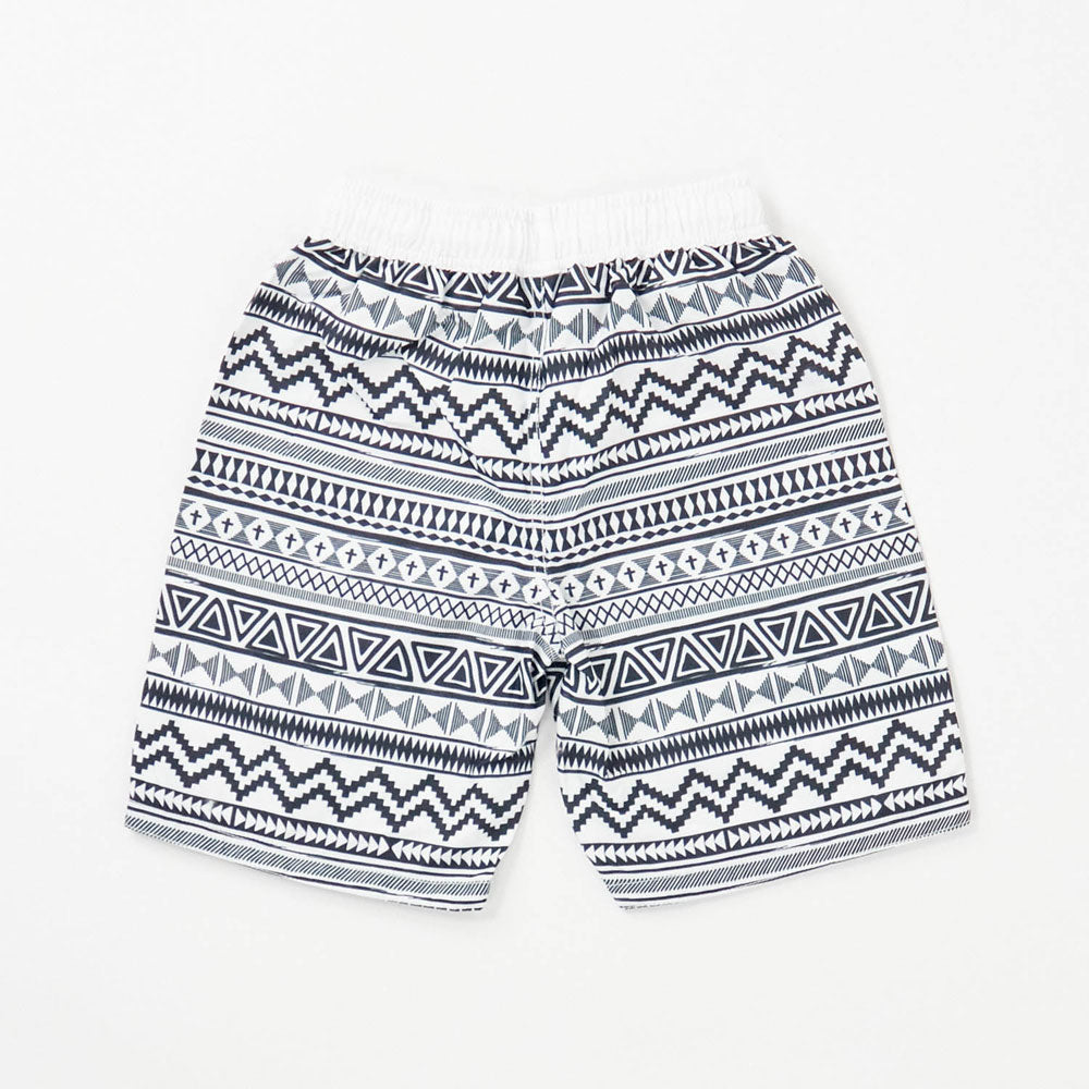 ネイティブ柄ハーフパンツ。ウエストはドローコード付きで多少大きめでも調整できます。