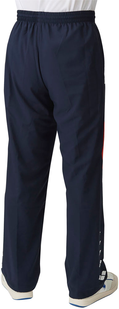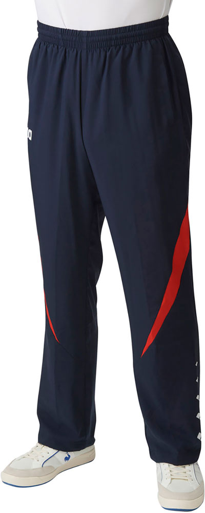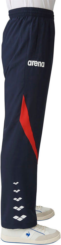 チーム用の布帛ロングパンツです。ノーマルシルエットでゆったり見えるパターンを採用しています。アリーナマークを5つ使用したデザインです。スイマーが濡れた身体に着用することを想定し、裏メッシュ仕様になっています。