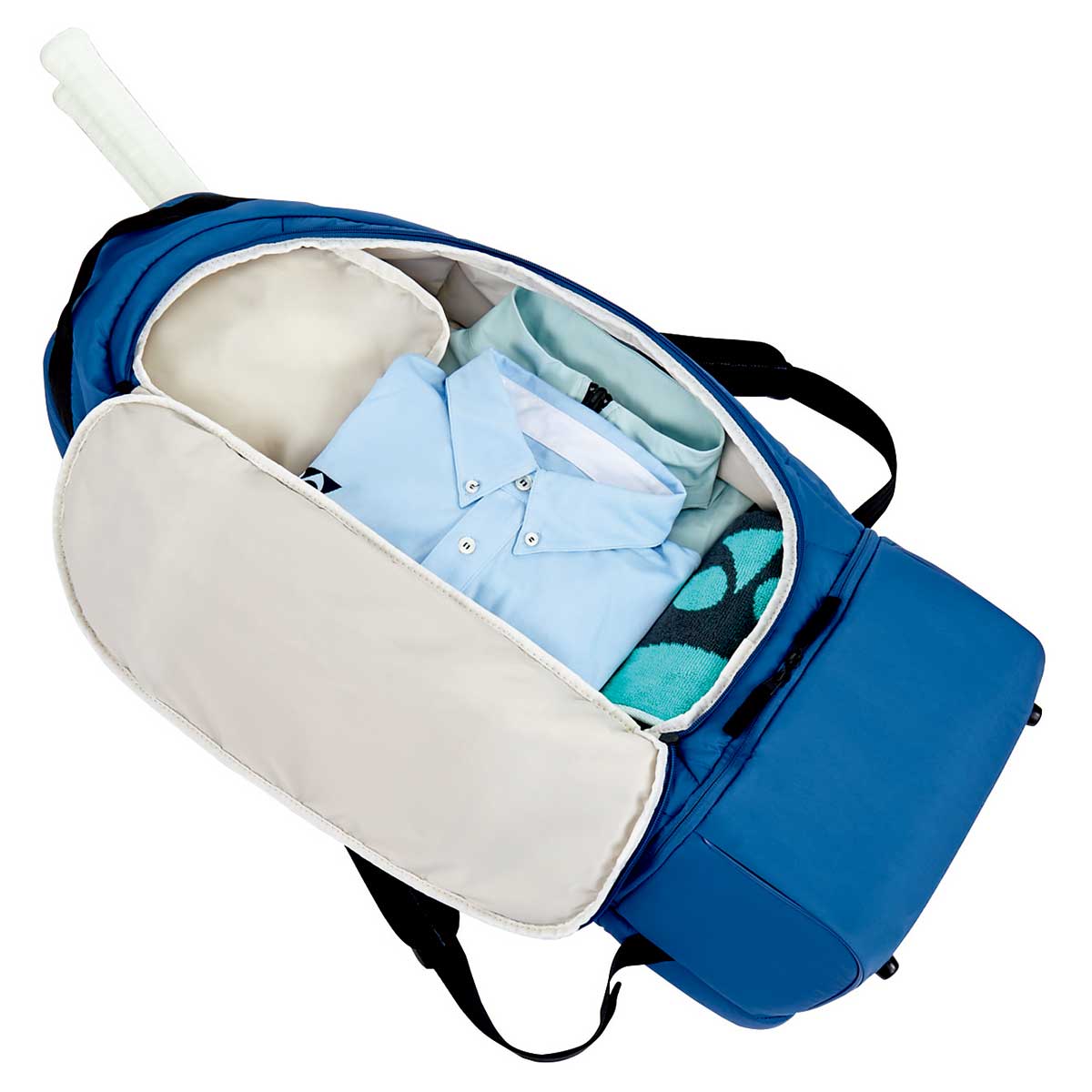 素材:ナイロン 仕様:正面ポケット 、シューズポケット、天マチポケット2個、500mlペットボトル収納ポケット、ラケット2本収納部屋、可変部屋仕切り、YKKファスナー、撥水仕様、底鋲