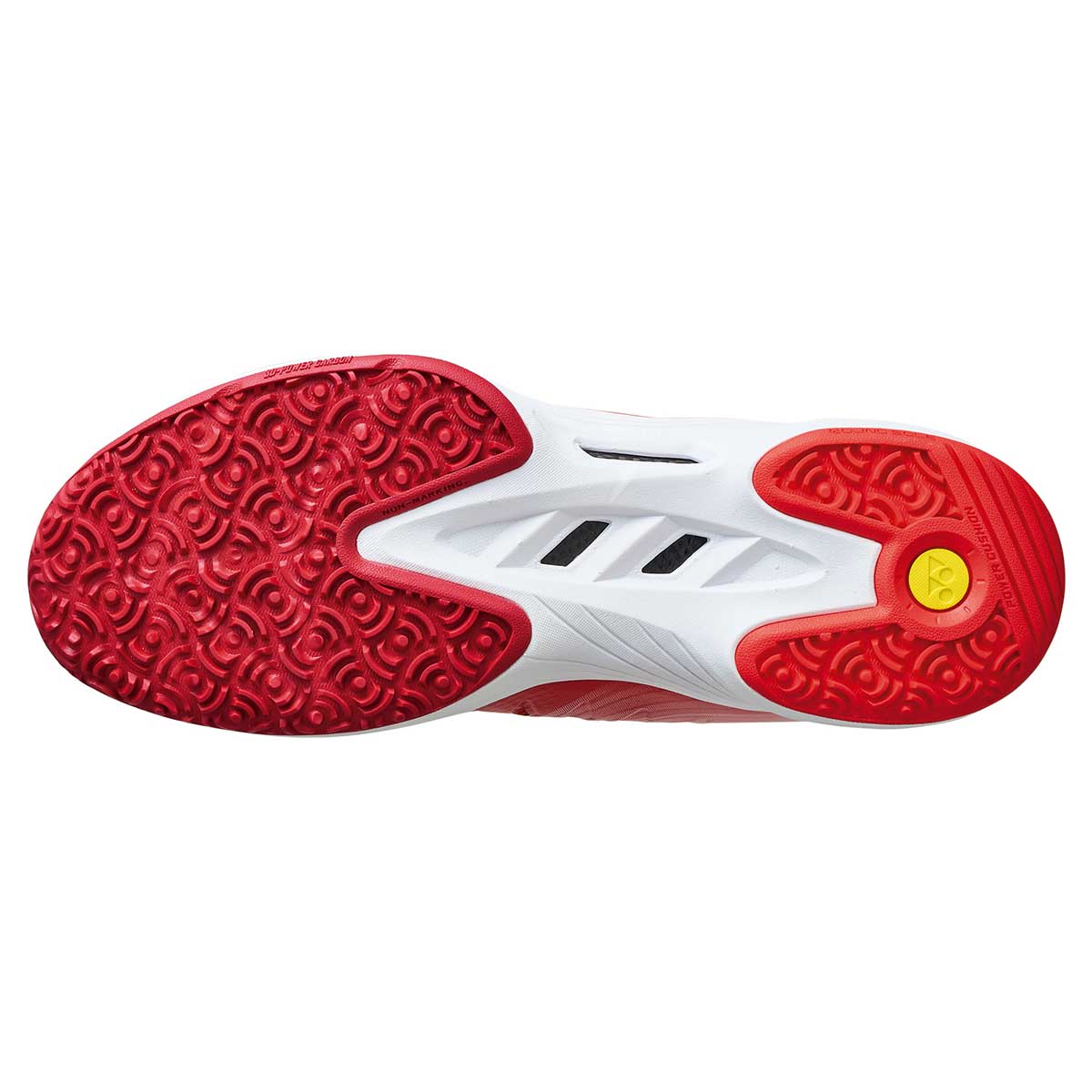 3DパワーカーボンとフェザーライトXがシリーズ最軽量を実現 パワークッション プラス 衝撃吸収性と反発性を併せ持つ衝撃吸収反発素材「パワークッション」がさらに進化。素材や形状の研究を重ね、従来の軽量性を維持しながら、衝撃吸収性28%アップ・反発性62%アップ(一般的な衝撃吸収材[EVA]との比較)を実現し、12mの高さから落とした生卵が、割れずに6m以上跳ね返る(※ヨネックス(株)調べ)新衝撃吸収反発素材。 3Dパワーカーボン 最適性能を実現するカーボン成型技術。3D立体形状のカーボンをシューズ内部に搭載することで、耐ねじれ性能の向上や適度なしなりで筋肉への負担を軽減。 フェザーライトエックス 一般的なEVA材よりも約30%※、軽量素材ハイパーフェザーライトからも約12%※の軽量化を実現。※ヨネックス(株)調べ デュラブルスキンライト ゴムのような弾力性と硬質プラスチックのような強靭さを併せ持つP.U.素材。フィット性と軽量性を向上。 トウアシストシェイプ 親指の圧迫感を解消したつま先設計とし、かつ、中足部とかかと部のサポート性を高めることで、シューズ内の足のズレを抑え、パワーロスのない素早いフットワークを実現。 ラウンドソールTM R5 アウトソール外周全体に3種類の丸み(10/7/5)を持たせ、自然な着地と蹴り出しが可能。※数字が大きいほど、ソール外側の丸みが大きく、安定性重視。特許第4958505号