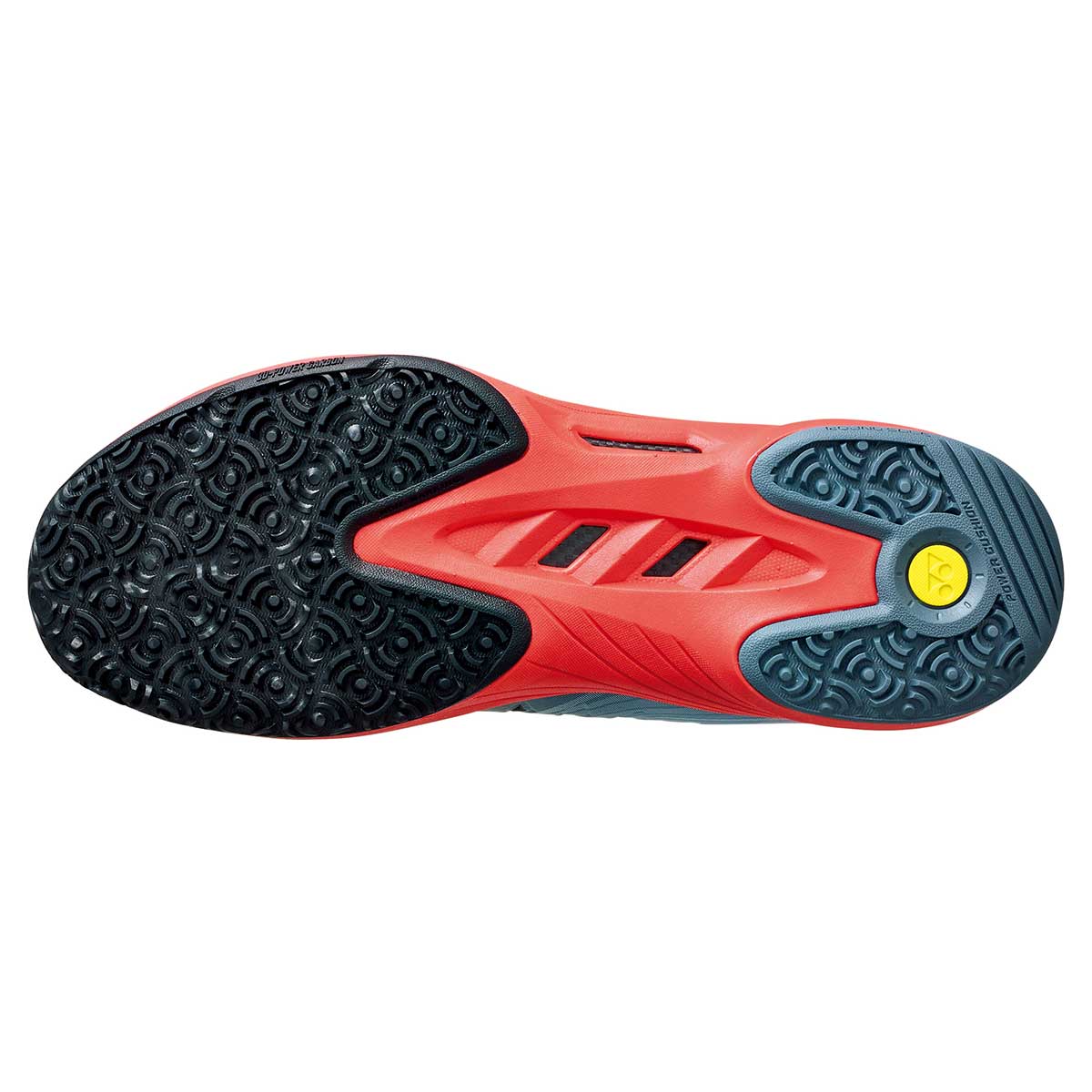 3DパワーカーボンとフェザーライトXがシリーズ最軽量を実現 パワークッション プラス 衝撃吸収性と反発性を併せ持つ衝撃吸収反発素材「パワークッション」がさらに進化。素材や形状の研究を重ね、従来の軽量性を維持しながら、衝撃吸収性28%アップ・反発性62%アップ(一般的な衝撃吸収材[EVA]との比較)を実現し、12mの高さから落とした生卵が、割れずに6m以上跳ね返る(※ヨネックス(株)調べ)新衝撃吸収反発素材。 3Dパワーカーボン 最適性能を実現するカーボン成型技術。3D立体形状のカーボンをシューズ内部に搭載することで、耐ねじれ性能の向上や適度なしなりで筋肉への負担を軽減。 フェザーライトエックス 一般的なEVA材よりも約30%※、軽量素材ハイパーフェザーライトからも約12%※の軽量化を実現。※ヨネックス(株)調べ デュラブルスキンライト ゴムのような弾力性と硬質プラスチックのような強靭さを併せ持つP.U.素材。フィット性と軽量性を向上。 トウアシストシェイプ 親指の圧迫感を解消したつま先設計とし、かつ、中足部とかかと部のサポート性を高めることで、シューズ内の足のズレを抑え、パワーロスのない素早いフットワークを実現。 ラウンドソールTM R5 アウトソール外周全体に3種類の丸み(10/7/5)を持たせ、自然な着地と蹴り出しが可能。※数字が大きいほど、ソール外側の丸みが大きく、安定性重視。特許第4958505号