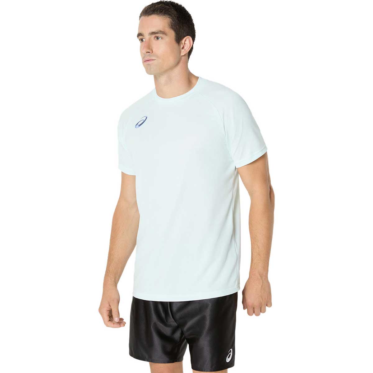 右胸のマークは刺繍、背面に大きめのアシックスロゴをラメプリントで表現した半袖シャツ